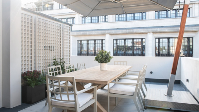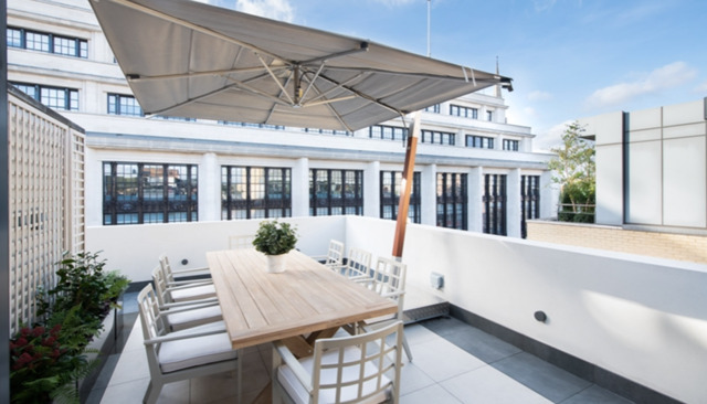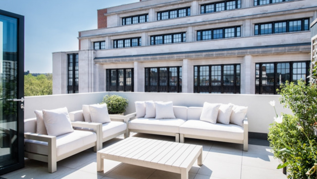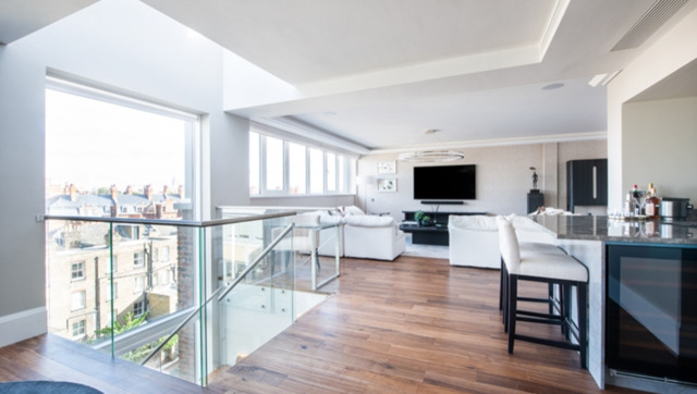 A stunning customized glass staircase offers uninterrupted double height views across London, which in turn leads you up into a unique entertainment and relaxation space offering several lavish areas as well as comfortable dining for 10 people. The open plan feel combines perfectly with two stunning outdoor seating areas that extends seamlessly through from the multiple Bi Folding doors.
