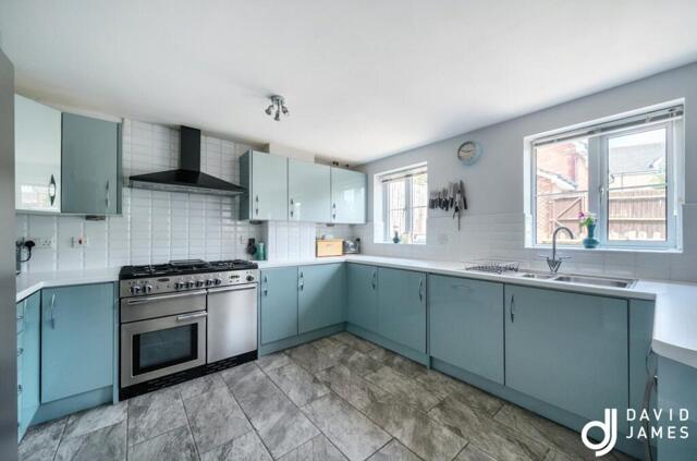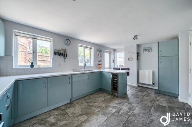 The well-planned and versatile living accommodation offers five bedrooms at first and second floor level; two with en-suite shower rooms complimented by a family bathroom on the first floor. The refitted kitchen has a breakfast bar, with a family room, separate large living room and a conservatory, currently utilised as a dining room with French doors leading into the garden offering a patio for entertaining and an elevated lawned garden, with access to the rear off street parking for two vehicles and the single garage.